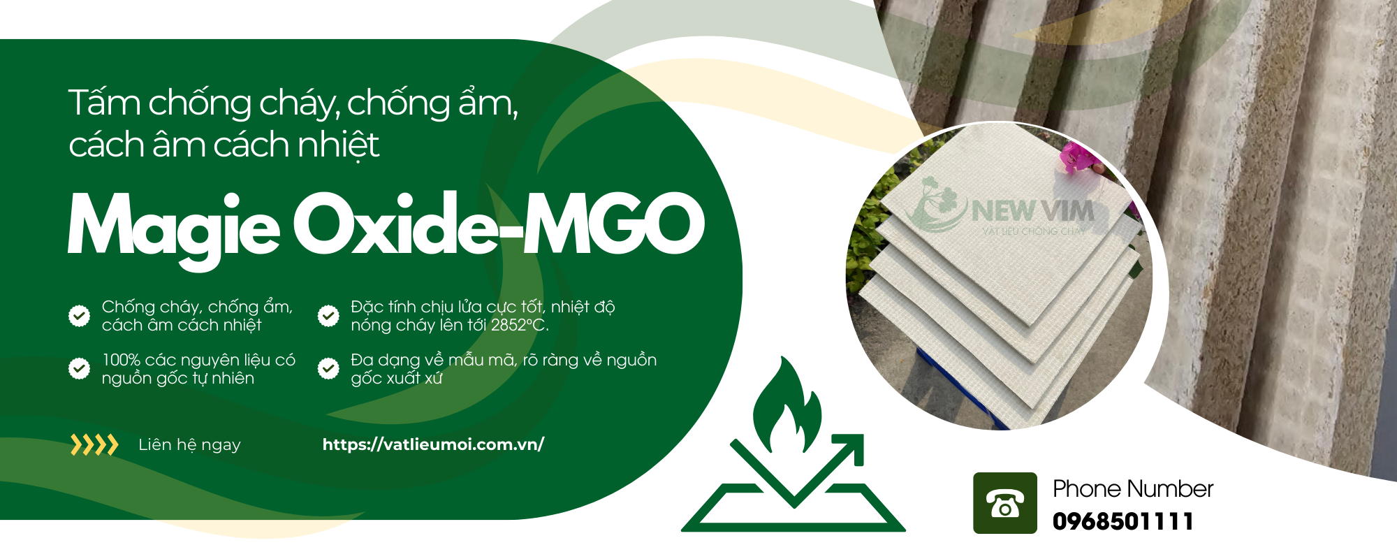 Tấm chống cháy, chống ẩm, cách âm cách nhiệt Magie Oxide-MGO là xu hướng “vật liệu xây dựng xanh” bền vững của tương lai, được sản xuất từ 100% các nguyên liệu có nguồn gốc tự nhiên với tính chất đặc biệt chịu nhiệt, chống ẩm cao. Thành phần chính là MgO có đặc tính chịu lửa cực tốt, nhiệt độ nóng cháy lên tới 2852ºC.